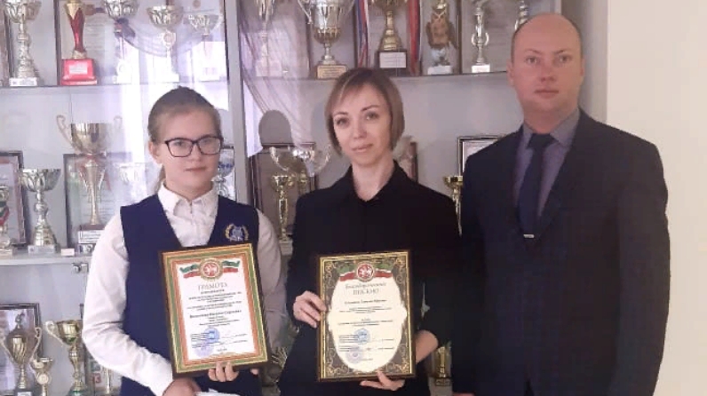 Учителю истории и обществознания Татьяне Толстовой вручили Благодарственное письмо за вклад в развитие системы потребительского образования в Республике Татарстан за подписью руководителя Госалкогольинспекции Республики Татарстан Жаудата Ахметханова и заместителя премьер-министра Республики Татарстан - министра образования и науки Республики Татарстан Рафиса Бурганова.