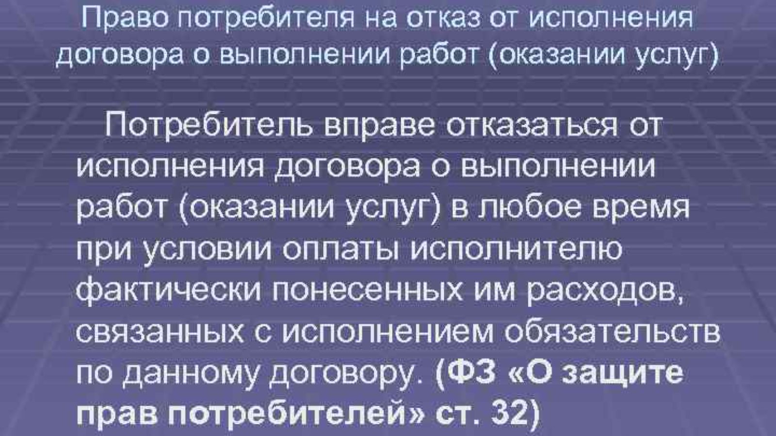 Потребителю дано разъяснение статьи 32 Закона РФ «О защите прав потребителей», согласно которой потребитель вправе отказаться от исполнения договора о выполнении работ (оказании услуг) в любое время при условии оплаты исполнителю фактически понесённых им расходов, связанных с исполнением обязательств по данному договору. Данная статья предусматривает, что даже если у потребителя нет претензий к качеству оказываемых услуг, то он имеет право в любое время, без указания каких-либо мотивов потребовать прекращения её выполнения. Основным условием применения нормы статьи является то, что потребитель должен уведомить исполнителя о расторжении договора и последний после получения уведомления обязан приостановить выполнение услуги.