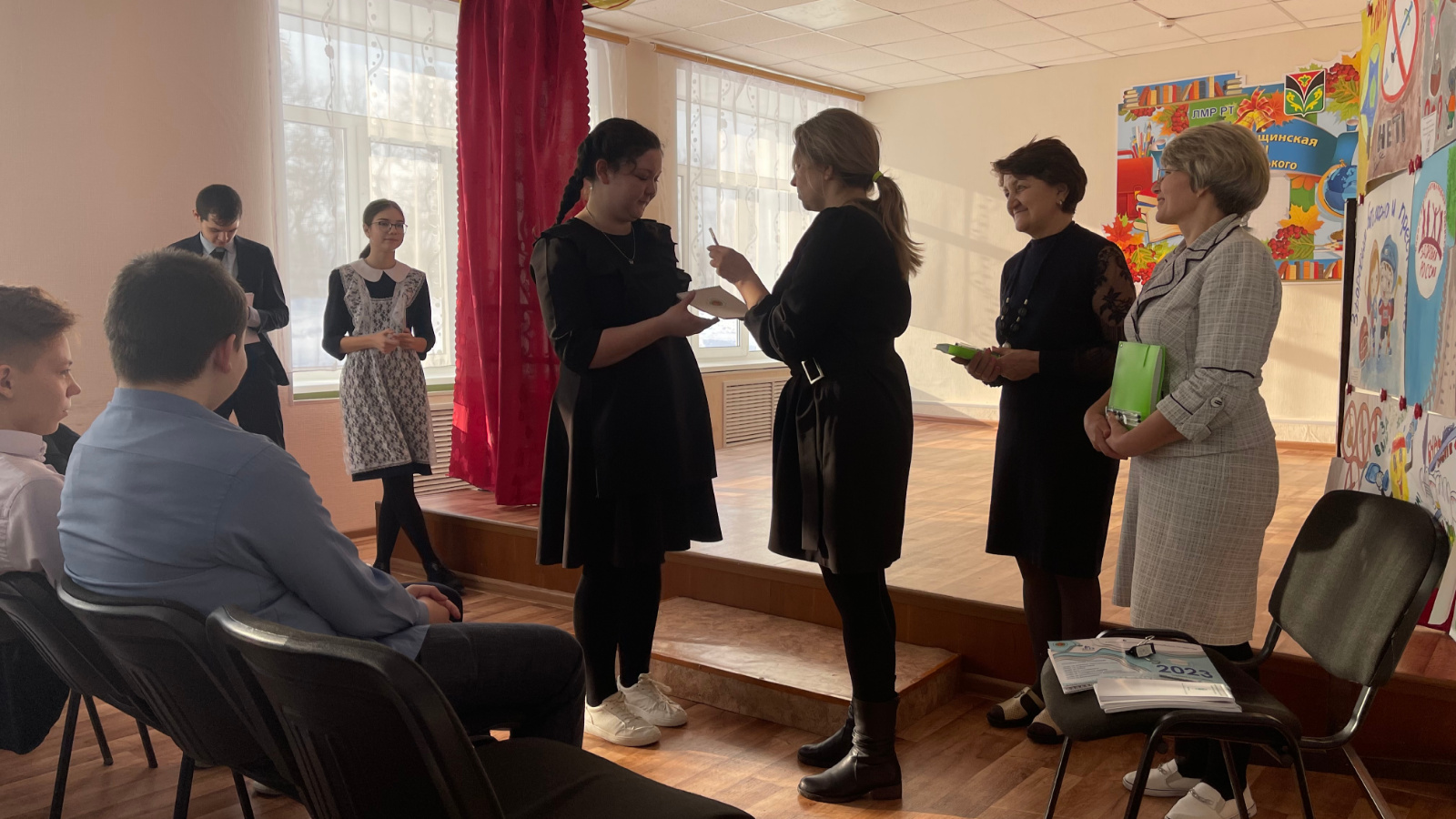 Лекция ахырында тестлаштыру этабын узган укытучыларга һәм укучыларга «2014-2025 елларга Татарстан Республикасында кулланучылар хокукларын яклауның комплекслы системасын үстерү» программасы логотибы белән канцтоварлар таратылды.